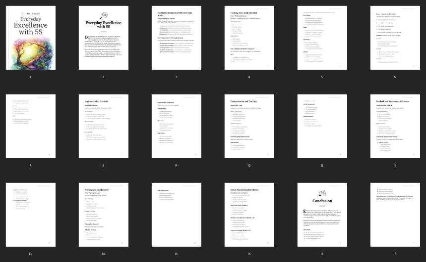 This resource is ideal for individuals and organizations committed to workplace excellence. Whether you're beginning your 5S journey or looking to reinforce existing systems, the guide provides the tools and structure needed for consistent application and sustainable results.