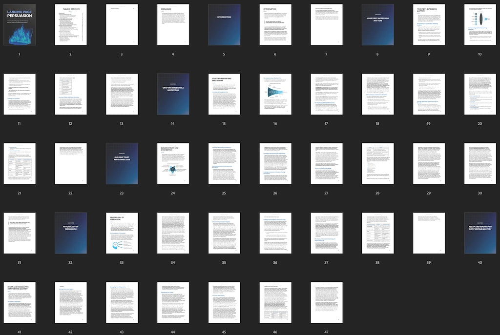 The content covers headline writing techniques, effective call-to-action strategies, storytelling methods to build credibility, insights into decision-making psychology, and best practices for optimizing page structure and performance.