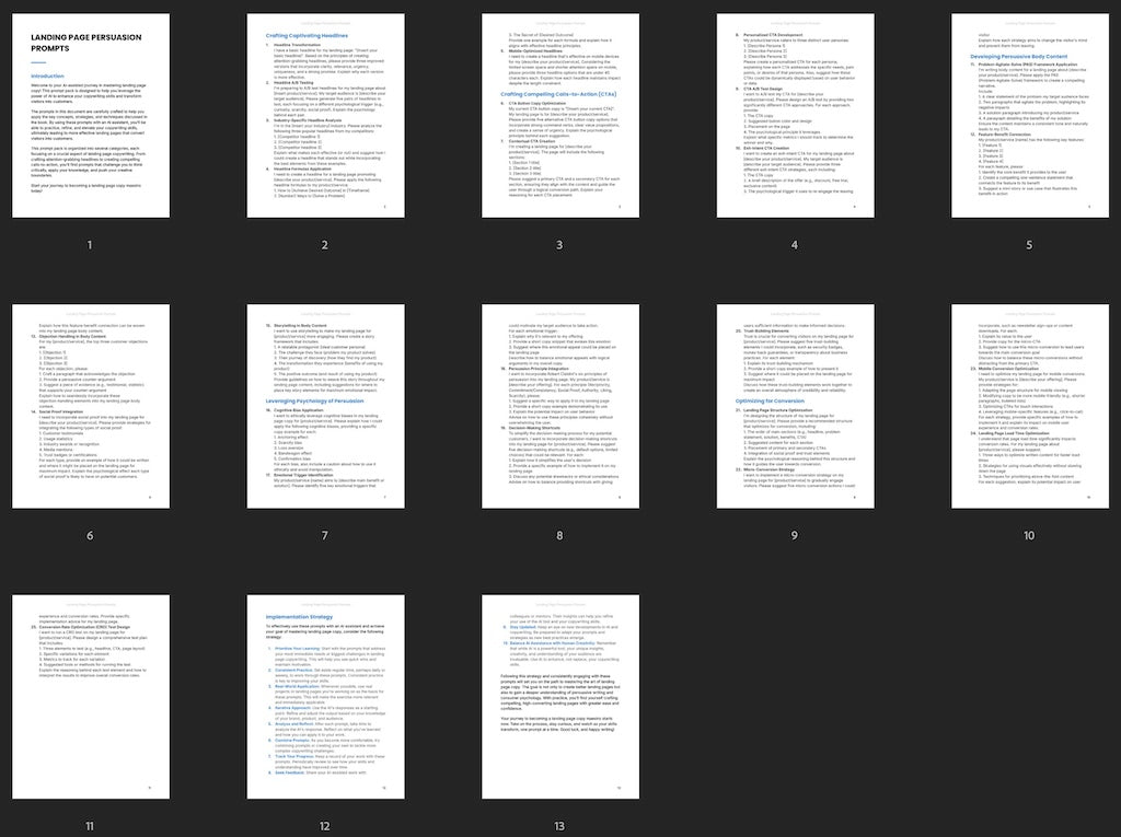 Within this resource, users will find prompts to create attention-grabbing headlines, formulate clear and motivating calls-to-action, and develop body content that addresses audience needs and benefits. The pack also incorporates psychology-based prompts focused on social proof, urgency, and other persuasive elements, alongside guidance for testing and optimizing copy to improve results continuously.