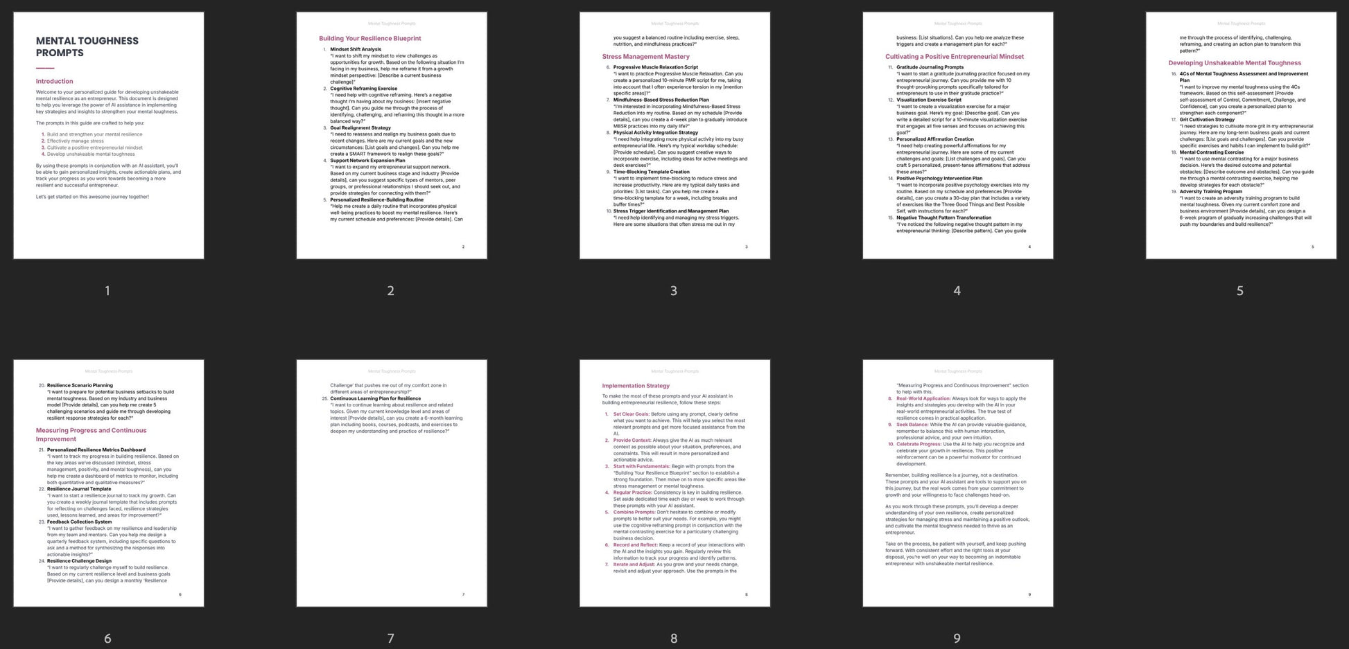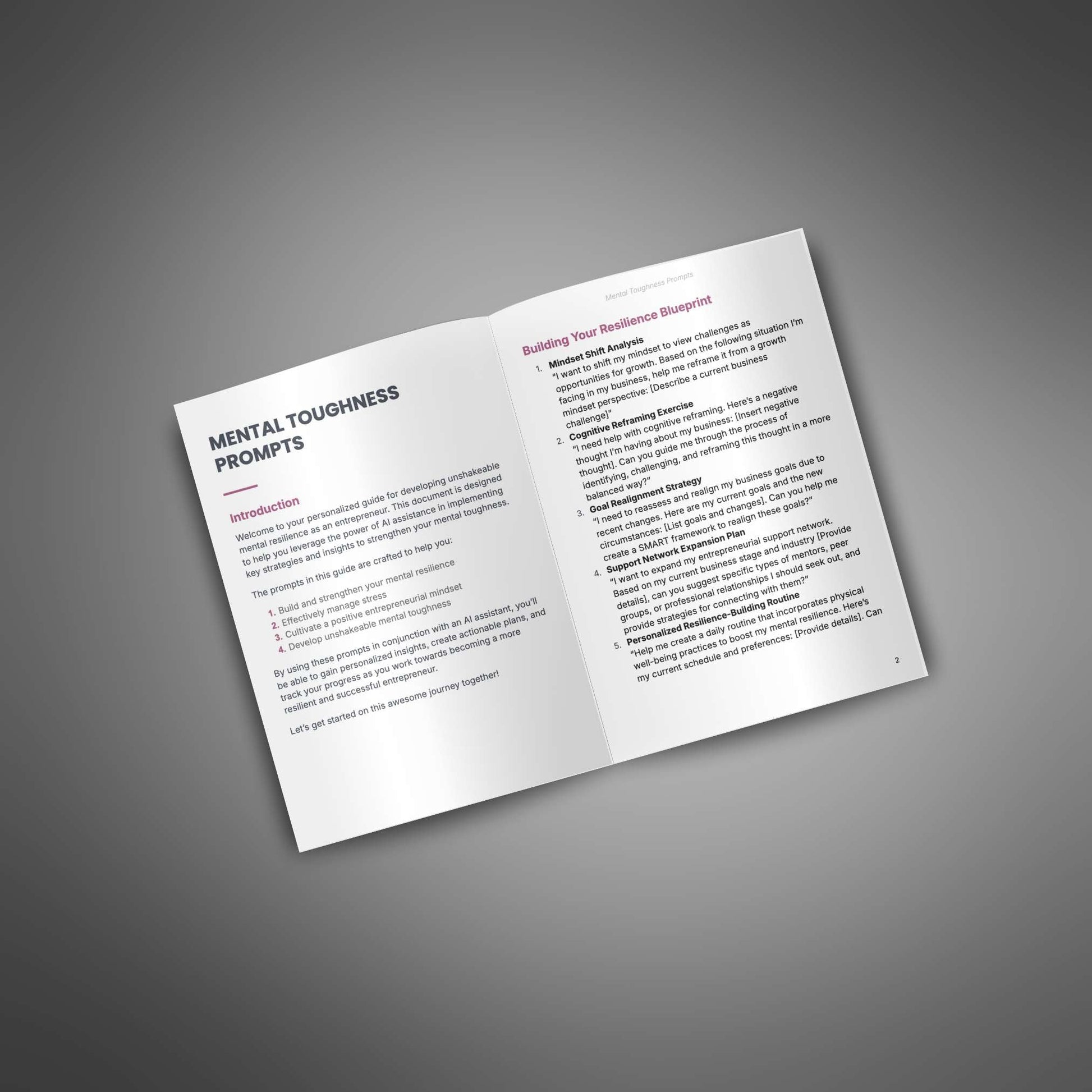 This prompt pack is designed to support individuals in developing mental toughness through AI-driven prompts that encourage self-reflection and growth. It offers practical approaches to building resilience, managing stress effectively, and cultivating a positive, focused mindset. These skills are essential for maintaining composure and persistence when facing professional challenges.