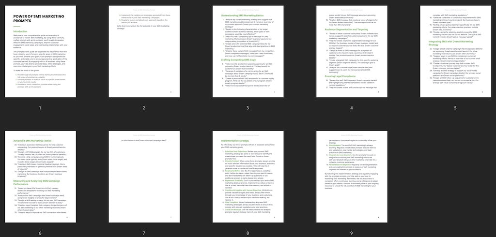 - Prompts for composing compelling SMS copy, including strong calls-to-action and customizable templates.