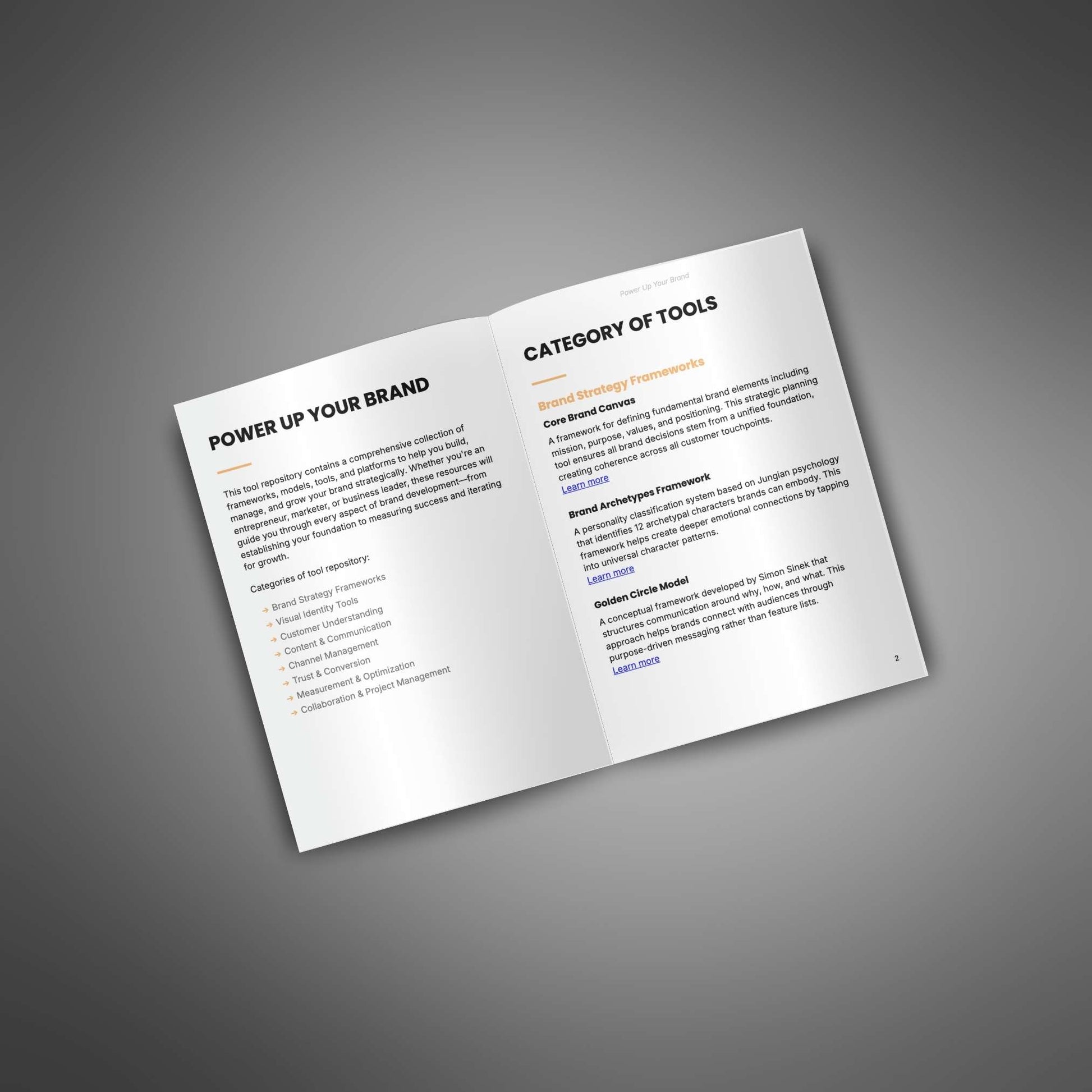 - Brand Strategy Tools: Frameworks to define mission, vision, values, and positioning