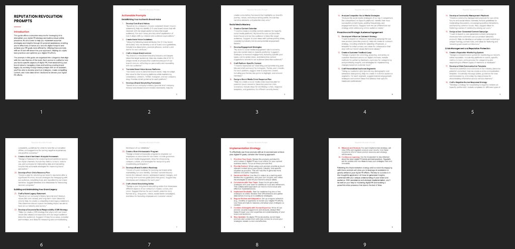 Included are prompts to assist in defining a unique brand voice that resonates with target audiences, designing effective social media strategies, generating engaging content, and navigating crisis situations while maintaining a positive online presence. The prompts also encourage the cultivation of brand trust and long-term loyalty.