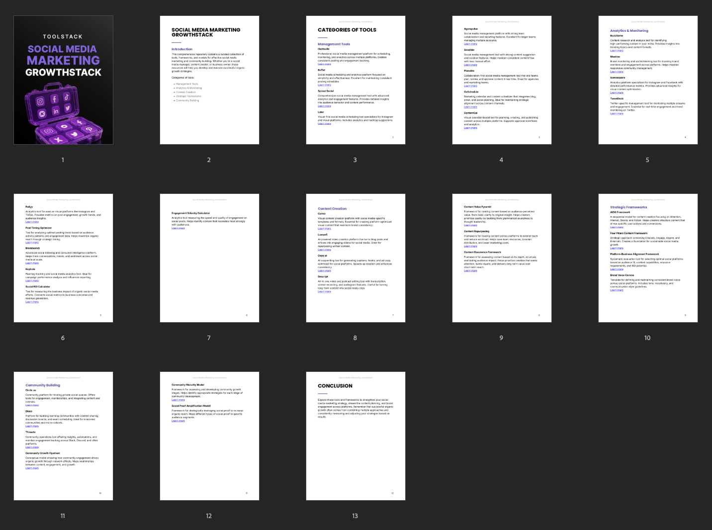This Toolstack offers a comprehensive collection of essential resources designed to support individuals and teams in strengthening their social media presence through self-directed growth and skill development. It addresses key aspects of social media marketing, providing tools and frameworks that facilitate content creation, performance analysis, community engagement, and strategic planning.