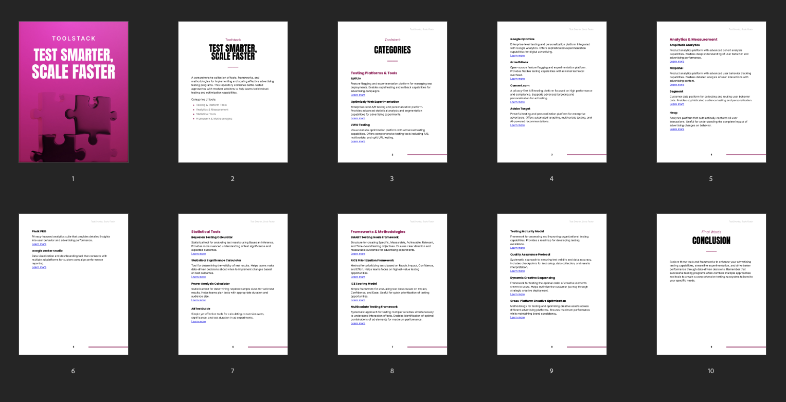 This Toolstack delivers a comprehensive set of resources designed to support the development of more effective ad testing systems, fostering growth through improved experimentation and analysis. It integrates established frameworks and tools to assist teams in refining their approach to testing, measuring, and optimizing advertising strategies.