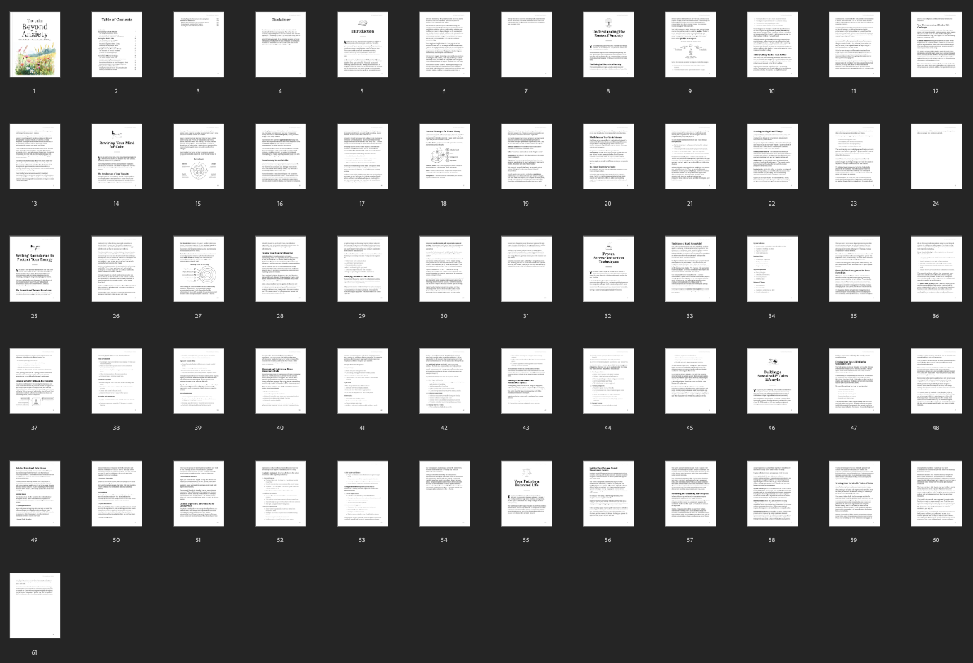 The content explains how anxiety impacts both mind and body and presents step-by-step approaches to reframe negative thought patterns and establish positive routines. It also offers guidance on setting personal boundaries to conserve energy and improve focus. Additionally, the guide includes calming practices such as breathing exercises, mindfulness, and time management strategies. Recommendations for enhancing sleep quality, nutrition, and daily habits support the pursuit of a more peaceful lifestyle.
