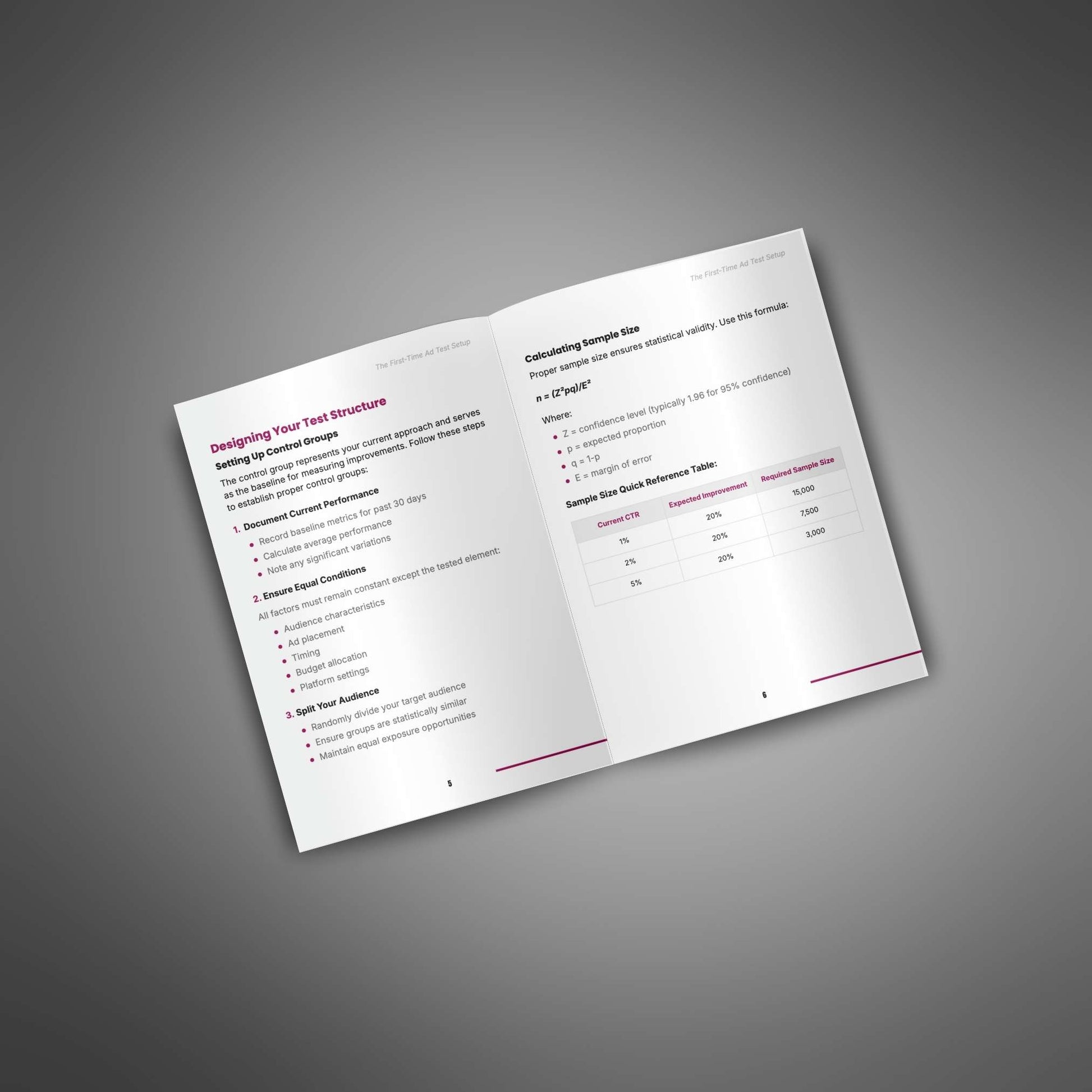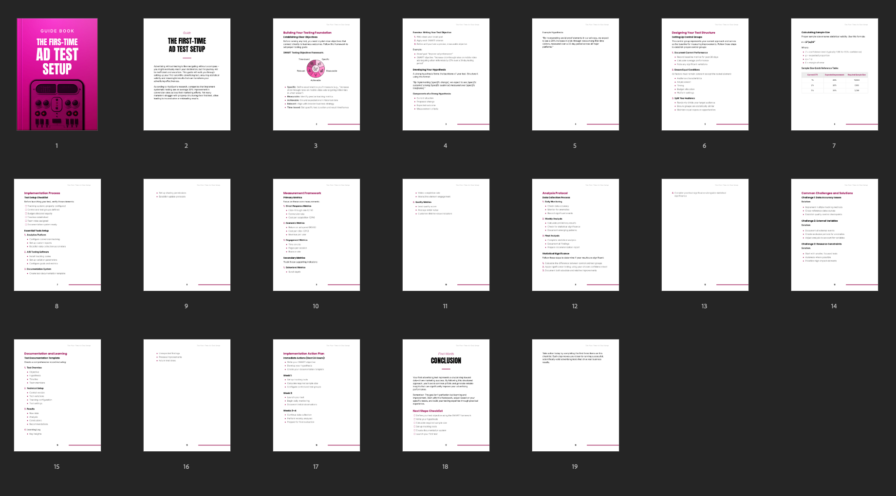 The content includes instruction on setting specific, results-oriented goals, formulating effective hypotheses, and establishing a proper testing environment with reliable controls and audience segmentation. Users are introduced to essential statistical considerations for sample sizing and are guided through setting up tools for tracking and measurement. The guide also offers insights into key advertising metrics and outlines how to evaluate outcomes with clarity. Additionally, it addresses common challenges in digital testing and provides solutions to maintain accuracy and consistency.