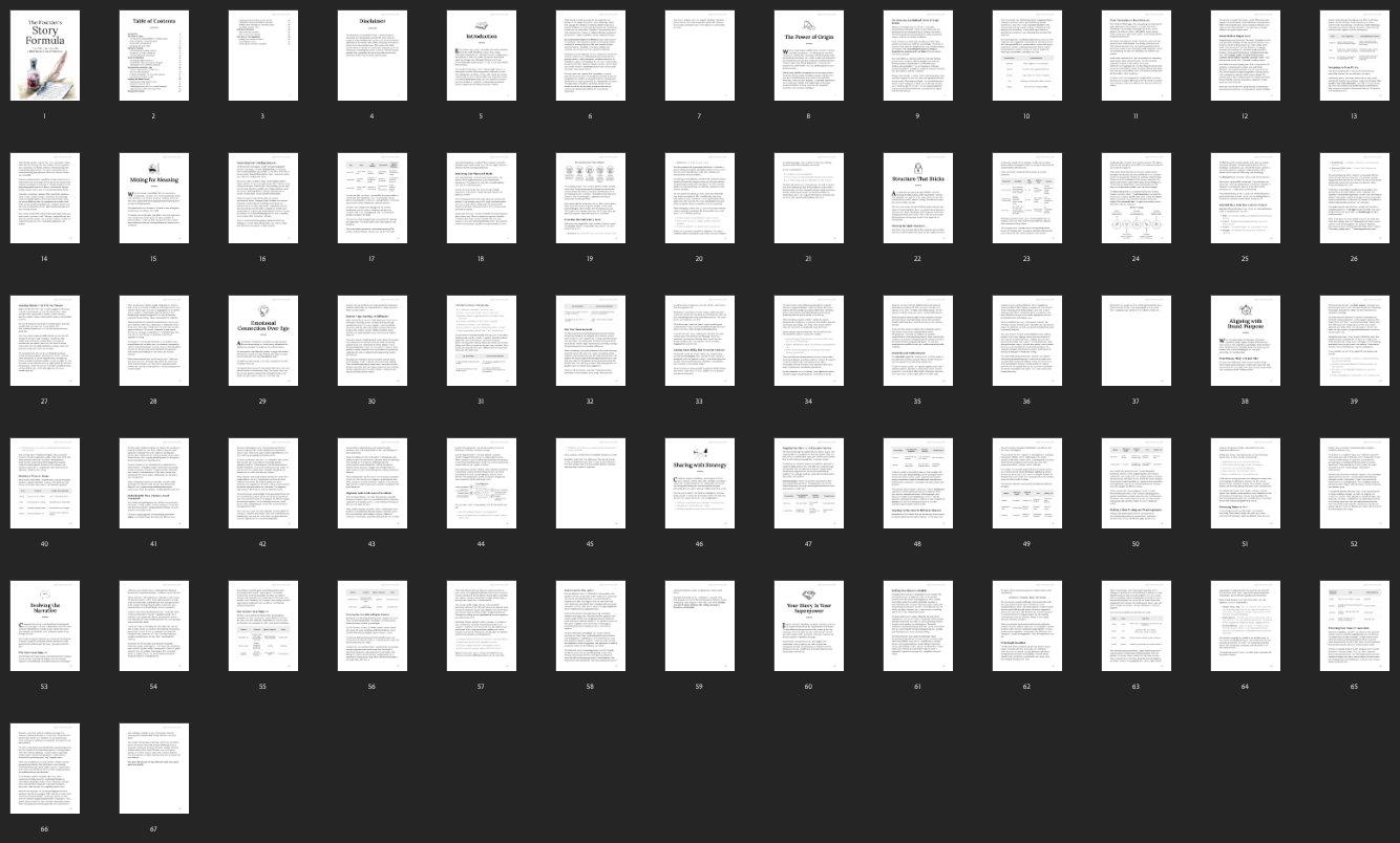 The guide outlines a practical process for identifying formative life and work moments, refining narrative structure, and incorporating emotional insight into storytelling. It also includes strategic considerations for using founder narratives across digital platforms, presentations, and internal brand documentation.