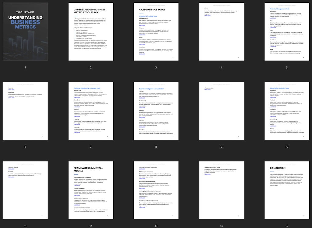 The toolset includes platforms for monitoring key metrics like website traffic, conversion rates, and user behavior, enabling actionable insights. Financial management resources support tracking cash flow, managing expenses, and forecasting financial stability. Customer engagement tools facilitate relationship management, retention improvement, and churn risk identification. Visualization tools offer dashboards and software to clearly present performance data and simplify reporting.