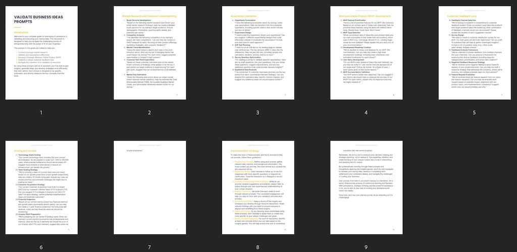Included are prompts to guide detailed market research for identifying target audiences and uncovering opportunities. The pack also helps users develop and test critical assumptions that influence business outcomes. Additionally, it provides clear guidance on designing and refining a Minimum Viable Product with measurable success indicators.