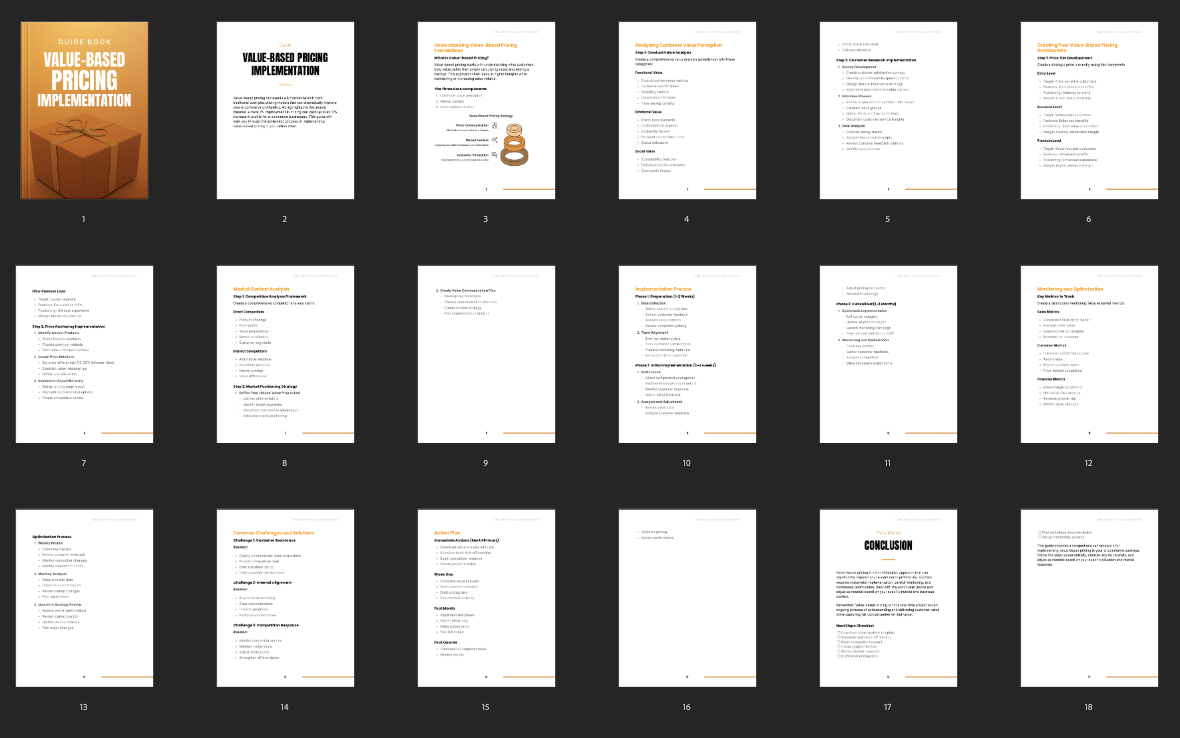 The guide covers essential principles of value-based pricing, methods for assessing customer perception and price sensitivity, and techniques for structuring pricing levels that maximize revenue potential. It also addresses market positioning strategies to differentiate offerings and compete effectively. A detailed implementation roadmap offers step-by-step direction for testing and refining pricing strategies. Additionally, guidance on tracking performance through key metrics enables ongoing evaluation and adjustment.