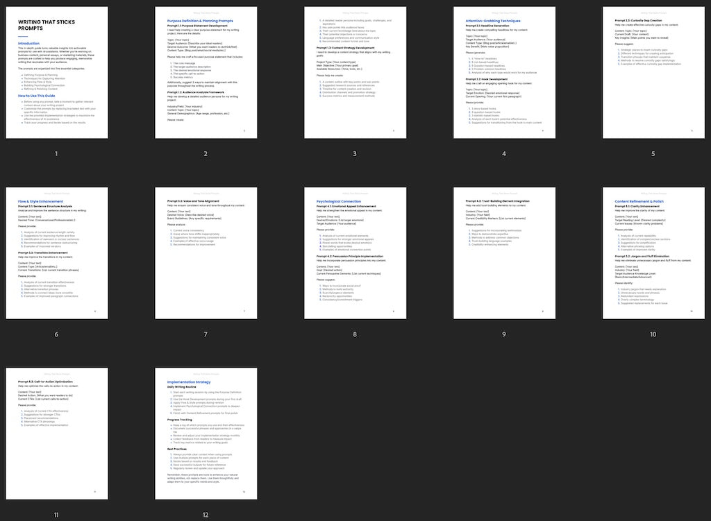 The prompts support clear communication by helping users create focused messaging aligned with audience needs. They guide the creation of compelling introductions and headlines that attract attention, while ensuring a consistent and natural flow throughout the content. Emphasis is also placed on integrating emotional resonance, persuasive techniques, and trust-building elements to foster deeper engagement.